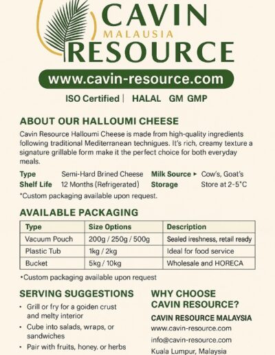 Halloumi Cheese – A traditional Cypriot cheese with a unique texture, perfect for grilling, frying, or serving fresh. Cavin Resource supplies high-quality halloumi cheese in bulk for restaurants, wholesalers, and foodservice providers globally.